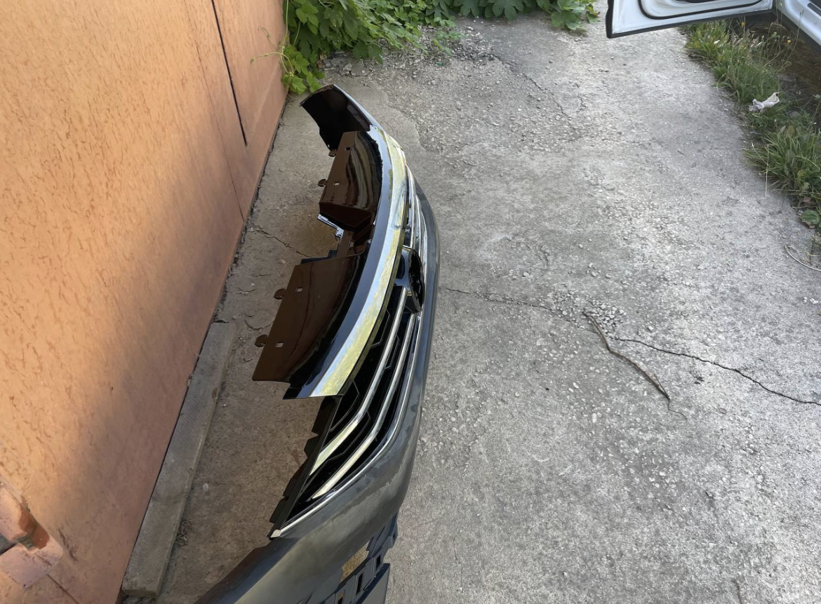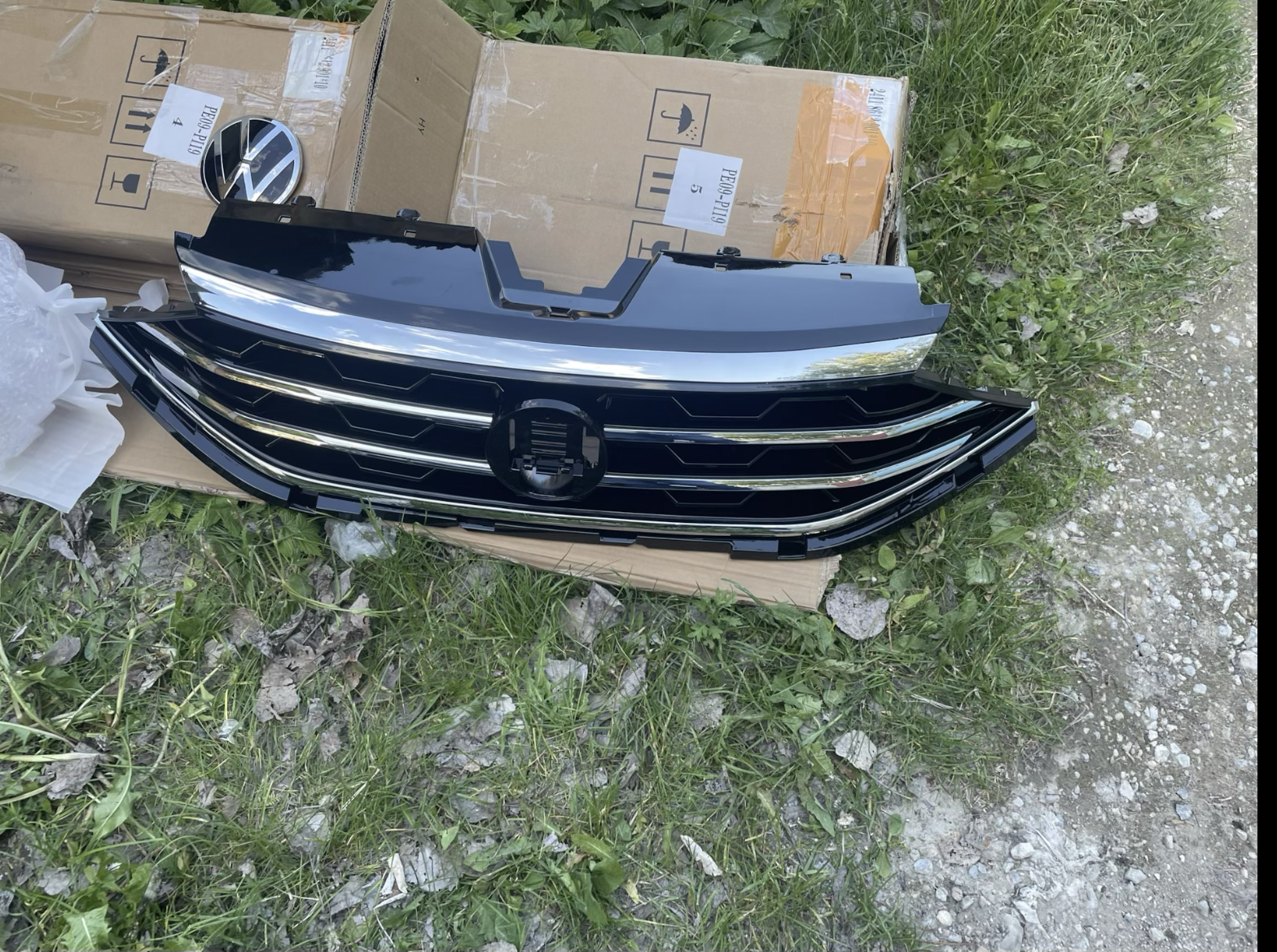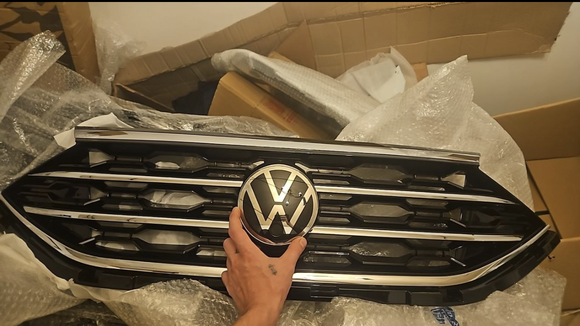 Так как ни кто до этого не устанавливал, делалось все в первый раз. Единственное, я точно уже знал , что без переделки бампера не обойтись . Поэтому , не зная на сколько это все затянется, была заказана штатная новая грунтованная облицовка бампера , а также : радиопрозрачный шильд VW для дистроника . В комплекте с решеткой, шел обычный пластиковый знак.