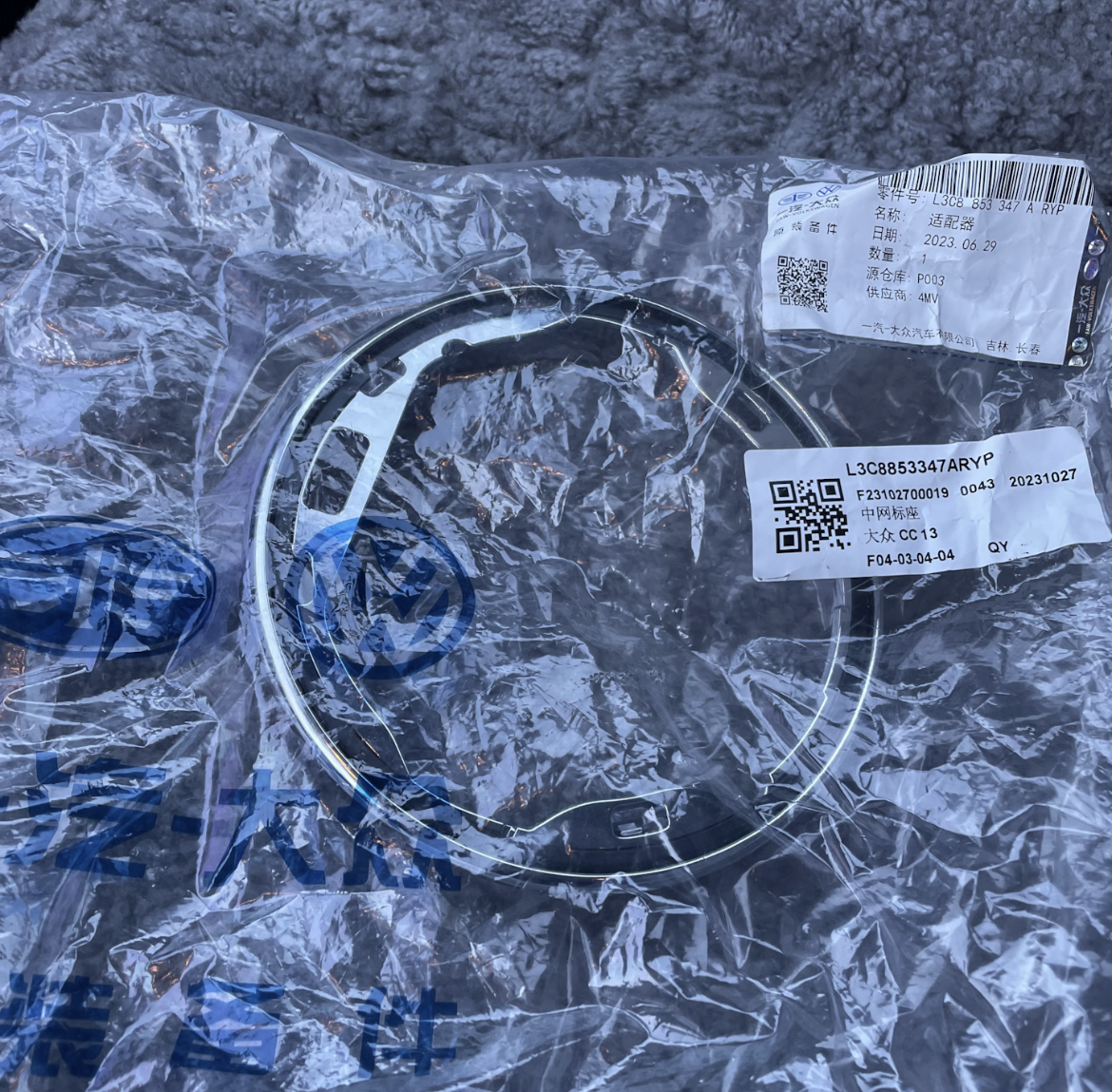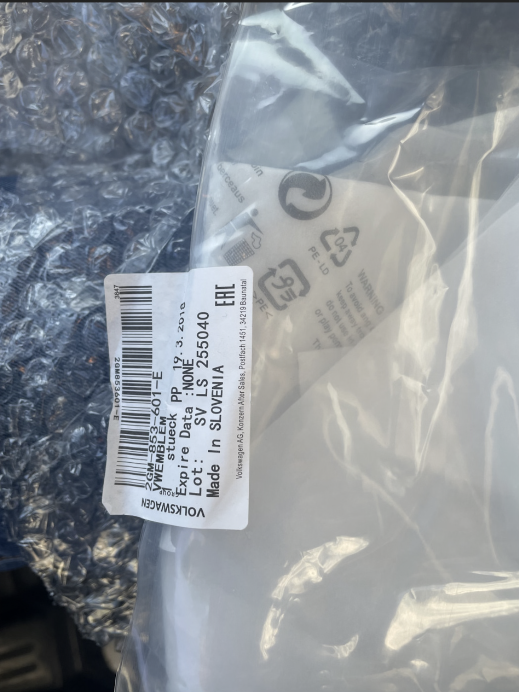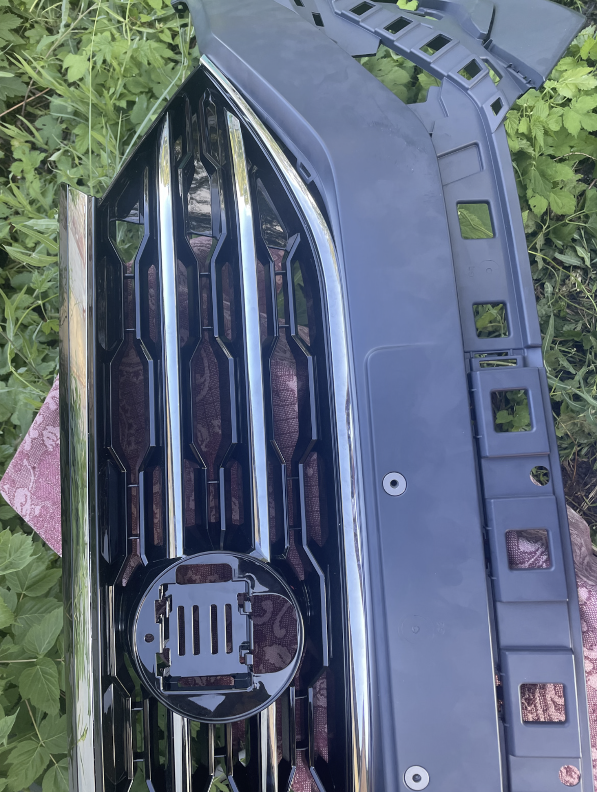 Так как ни кто до этого не устанавливал, делалось все в первый раз. Единственное, я точно уже знал , что без переделки бампера не обойтись . Поэтому , не зная на сколько это все затянется, была заказана штатная новая грунтованная облицовка бампера , а также : радиопрозрачный шильд VW для дистроника . В комплекте с решеткой, шел обычный пластиковый знак.
