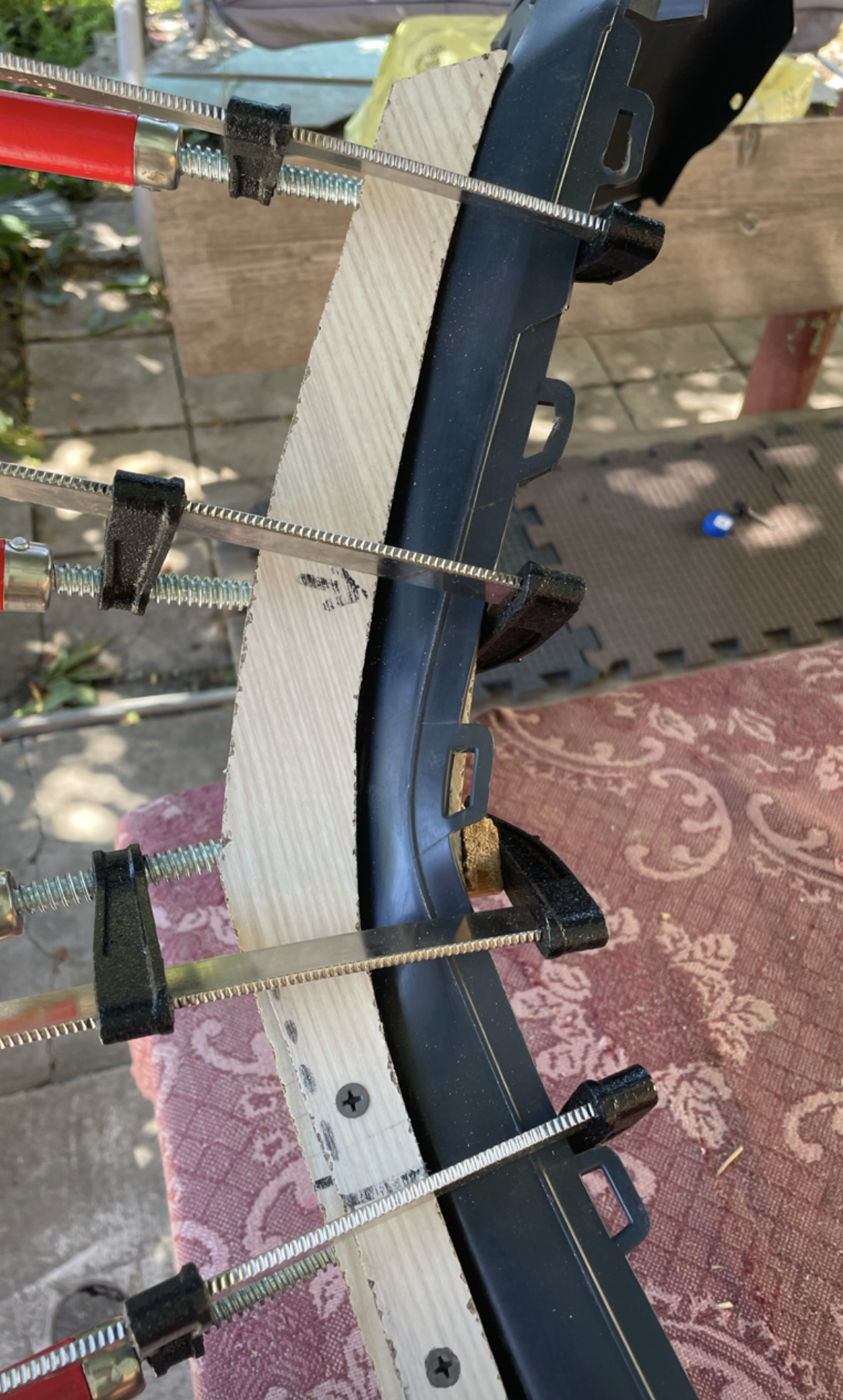 (Именно в процессе примерок, стало понятно, что одного температурного воздействия будет не достаточно , несмотря на то , что облицовка бампера изготовлена из податливого PP- пластика и все изготовленные деревянные колодки были выброшены в мусорку)